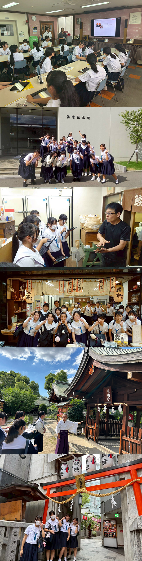 「大阪の産業」について学ぶチームはSHARP特選株式会社、「大阪の食」チームは黒門市場、「大阪の企業」チームは江崎記念館、「大阪の刃物」チームは堺刃物ミュージアムを訪問しました。4チームそれぞれのテーマを通して大阪の歴史・文化・産業について学んでおります。1学期から、リサーチやアンケート作り等事前学習を経ての校外活動でした。今回の訪問に際してご協力いただきました皆様、ありがとうございました。