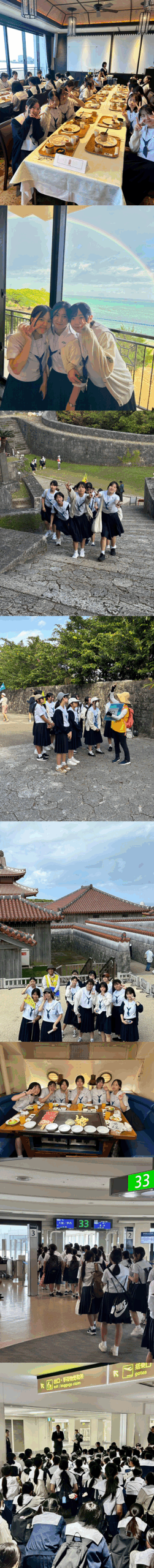 修学旅行最終日は、世界遺産の首里城を見学しました。守礼門の前でクラス写真を撮った後、復元途中の首里城をガイドさんの案内で見て回りました。琉球王国の歴史や文化に触れ、城外の眺望も楽しむことができました。昼食はサムズレストランで、シェフのパフォーマンスを見ながら、ステーキをいただきました。その後、那覇空港へ向かい、伊丹空港に全員無事帰ってきて、解団式を行いました。添乗員さんや現地の方々などさまざまな人のおかげで、楽しくてステキな思い出がたくさんできた修学旅行になりました!!