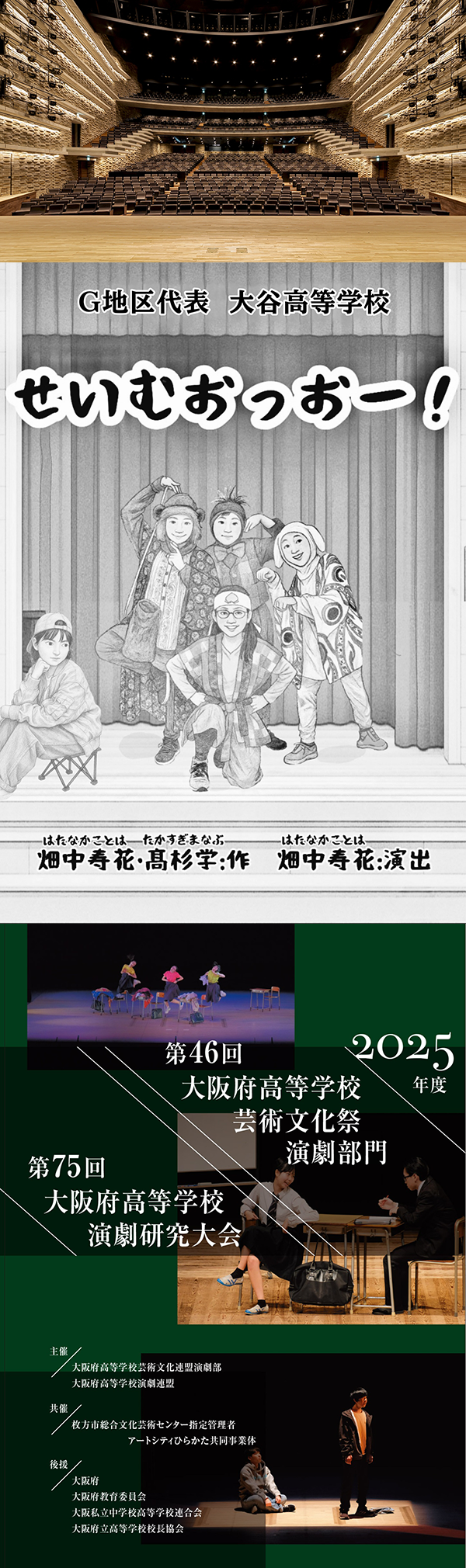 11月29日(土)、11月30日(日)に枚方市総合文化芸術センター関西医科大大ホールにて第75回大阪府高等学校演劇研究大会が行われ、大谷高等学校演劇部も出場いたします。