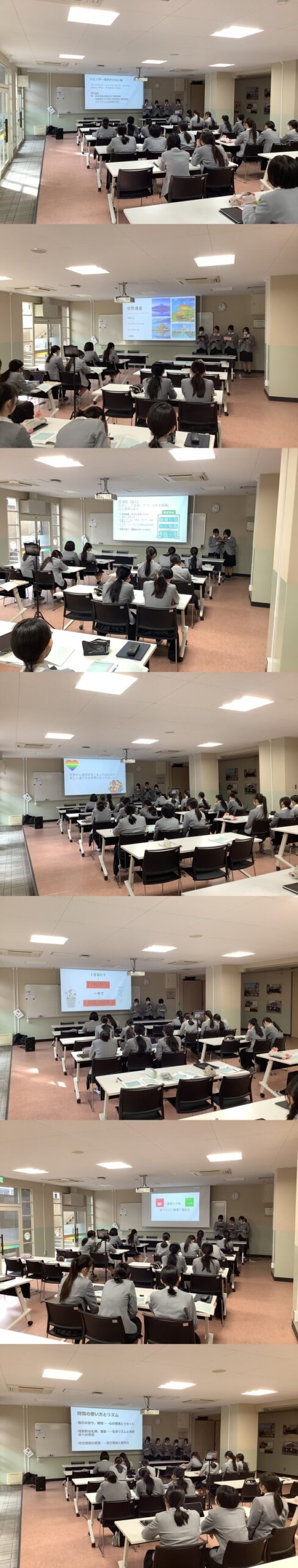高校1年生の凛花コースの生徒が7つのチームに分かれ、テーマに合わせて調べた世界で起こる問題などについて、実際に行われているの対策や各チームで考えた解決策などを発表しました。